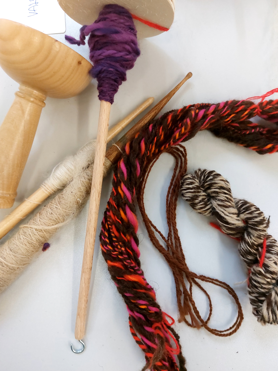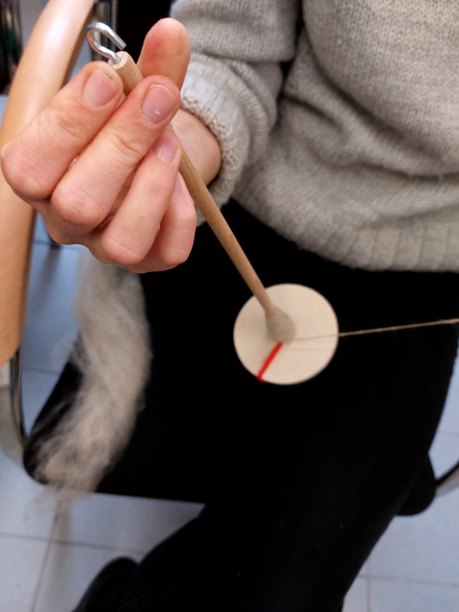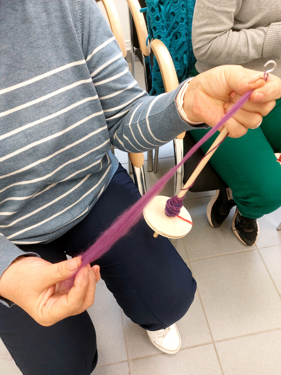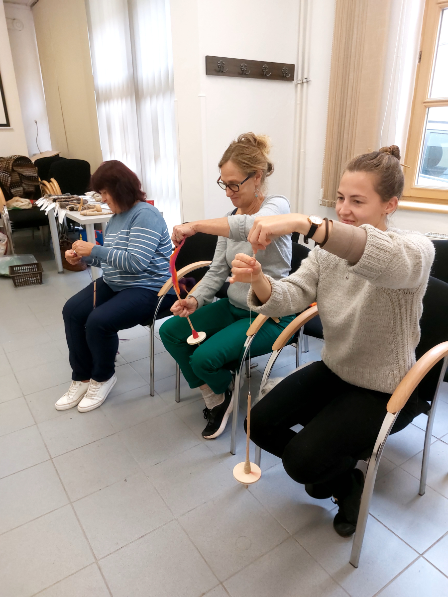Pod vedením Kateřiny Mráčkové se účastnice učily příst vlnu na vřetánku.
